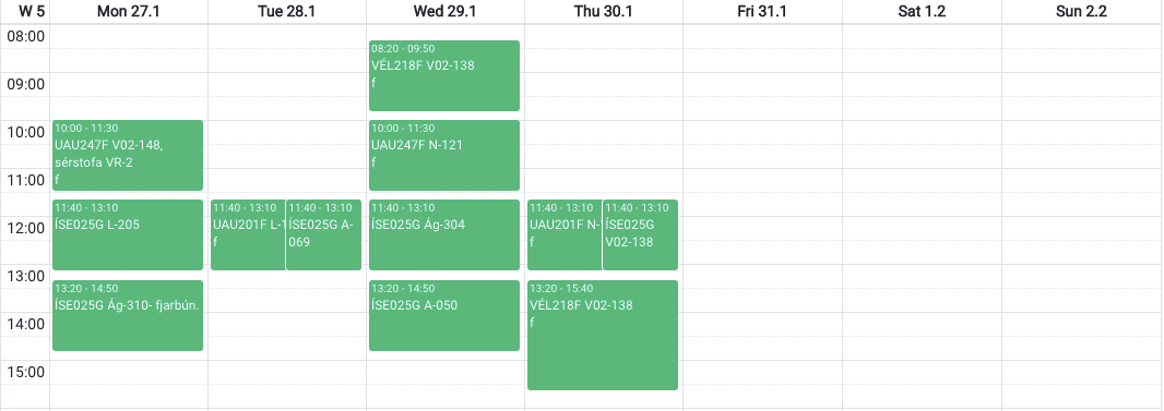 Schemat är ganska chill, jag är till exempel helt ledig på fredagar, vilket är bra då det gör att jag kan ta igen det jag inte har hunnit med i veckan och på så sätt kan ta det lite lugnare på helgen. Det konstigaste med schemat är att jag varje dag har föreläsningar från 11.40-13.10, lite oklart när man ska äta lunch då? Dessutom finns det ingen akademisk kvart att tala om, vilket också är lite ovant. Men allt som allt är jag ganska nöjd, jag lyckades undvika schemakrockar med kurserna här på University of Iceland (finns fortfarande lite krockar med KTH-kursen, men det problemet är jag inte ensam om att ha iaf).