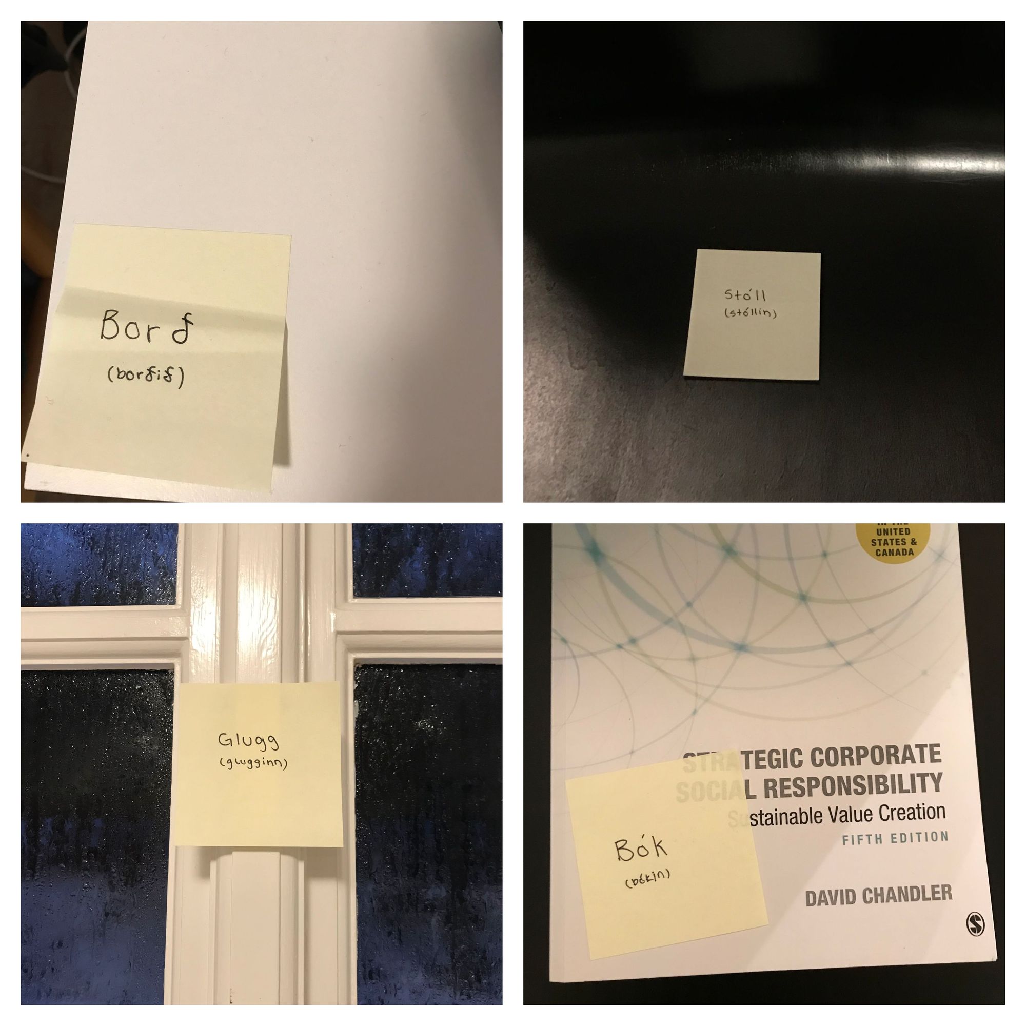 Vi har också fått lära oss ord på några vardagliga ting, så just nu har jag satt upp post-it lappar runt om i lägenheten för att t.ex. lära mig orden för fönster och stol. Problemet med isländska är att det ser ut som att man vet hur man ska uttala ett ord, men man har ofta helt fel, det finns många ljud på isländska som vi inte riktigt har på svenska...